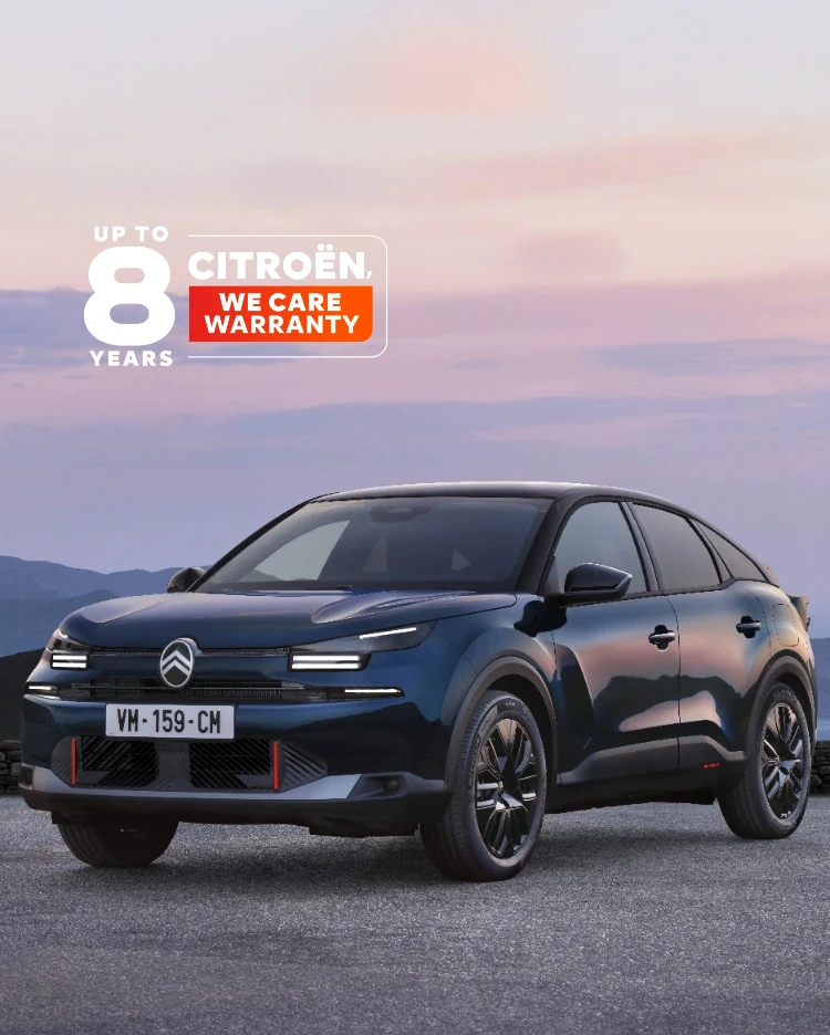 - Garanzia Citroën We Care: estensione di garanzia di 6 anni con copertura speciale dopo la scadenza della garanzia standard. Si attiva effettuando la manutenzione presso la rete autorizzata Citroën secondo il piano raccomandato e resta valida fino al tagliando successivo, fino a un massimo di 8 anni o 160.000 km. Copre componenti essenziali come motore, cambio e trasmissione per tutti i veicoli nuovi immatricolati dal 10 gennaio 2025.